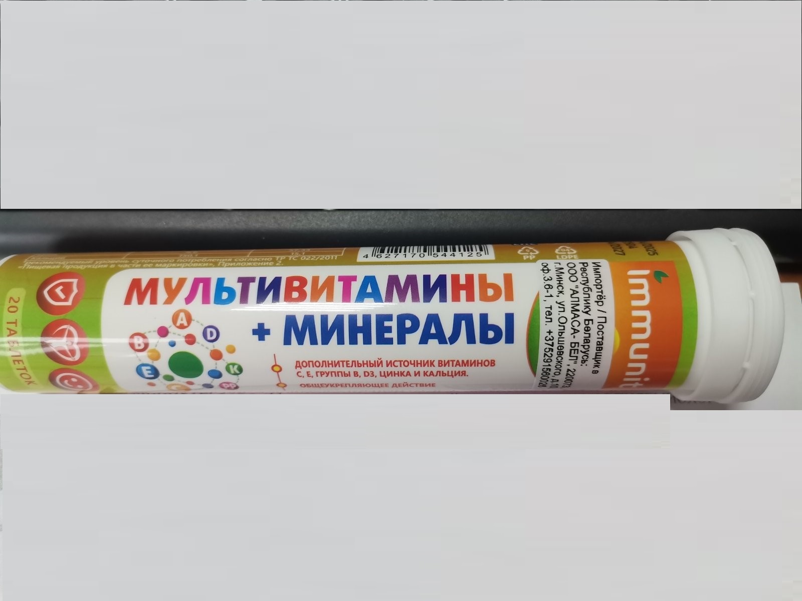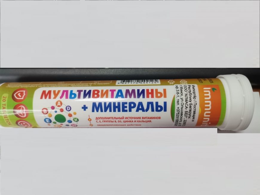 Биологически активная добавка к пище «Шипучие таблетки. Мультивитамины+минералы», таблетки массой 4г (Multivitamins + Minerals Effervescent, 4g tablet). для реализации населению в качестве биологически активной добавки к пище – дополнительного источника витаминов С, Е, группы В, D3, цинка и кальция. Компоненты, входящие в состав БАД, способствуют укреплению иммунитета, повышения стрессоустойчивости организма человека, профилактики хронической усталости, повышения уровня антиоксидантов, благотворного влияния на нервную и сердечно-сосудистые системы организма человека. Состав: витамин D3, витамин Е, витамин В1, витамин В2, витамин В6, витамин С (L-аскорбиновая кислота), карбонат кальция, глюконат, карбонат магния, глюконат цинка, амарант, желтый закат (краситель), мальтодекстрин, лейцин, лактоза, гидрокарбонат натрия (Е500) (разрыхлитель), лимонная кислота (Е330) (регулятор кислотности), Микс Фрукт (ароматизатор), аспартам (Е951 подсластитель). Способ применения: взрослым по 1 таблетке в день, предварительно растворив в 1 стакане воды (200 мл) комнатной температуры. Противопоказания: индивидуальная непереносимость компонентов БАД, беременность, кормление грудью, фенилкетонурия. Перед применением необходимо проконсультироваться с врачом. Условия хранения: хранить в сухом, защищенном месте при температуре не выше +250С. Изготовитель: «Anhui Kangbote Health Food CO., Ltd» Taihe County Chengguan Town Industrial Park, Fuyang, Anhui, Китай. Производственная площадка No:8th Sangyuan Street, Сhengguan District, Taihe, PR China Post Code 236600 Китай. Срок годности 2 года. Партия Е2504. Дата изготовления 08.04.2025, годен до:08.04.2027. Импортер/Организация уполномоченная принимать претензии от потребителей: ООО «АЛМАСА» 660064, Красноярский край, г. Красноярск, ул. им. Академика Вавилова, д1, строение 50, корпус.2, Российская Федерация. Тел.+7(391) 276-81-35. Эл. почта: Elena.almasa@mailru. Импортер/Поставщик в Республику Беларусь: ООО «АЛМАСА-БЕЛ» 220073, г.Минск, ул.Ольшевского, д. 10, оф. 3.6-1. Свидетельство о государственной регистрации №AM.01.01.01.003.R.00401.08.22 от 11.08.2022, с содержанием биологически активных веществ в суточной дозе, указанной в рекомендациях по применению, превышающим верхний допустимый уровень их потребления, установленный приложением 5 раздела 1 «Требования безопасности и пищевой ценности пищевых продуктов» Единых санитарно-эпидемиологических и гигиенических требований к продукции (товарам), подлежащей санитарно-эпидемиологическому надзору (контролю), утвержденных Решением Комиссии Таможенного союза от 28.05.2010 №299: содержание витамина D3 в суточной дозе  биологически активной добавки к пище составляет 30 мг в 1 таблетке, при установленном для витамина D верхнем допустимом уровне 15 мкг в сутки, содержание витамина В1 в суточной дозе биологически активной добавки согласно рекомендациям по применению составляет 6 мг в 1 таблетке, при установленном для витамина В1 верхнем допустимом уровне 5мг в сутки.